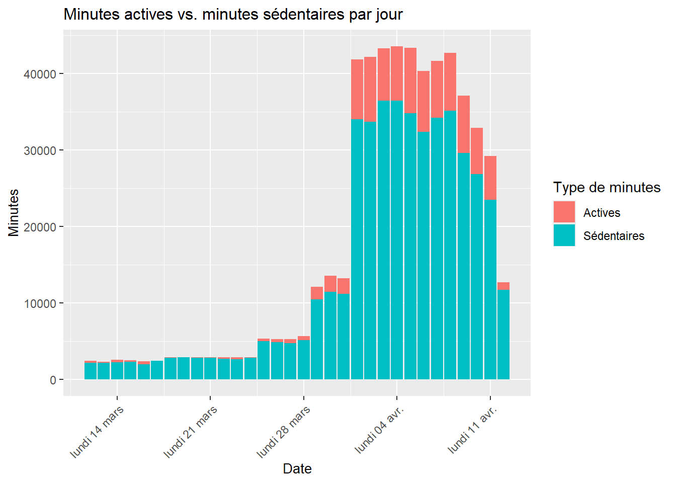 Les minutes sédentaires constituent l’essentiel du volume quotidien, ce qui traduit un comportement global majoritairement statique. À partir de la fin mars, puis surtout au début avril, on observe une hausse brusque du total des minutes enregistrées, liée à une augmentation du nombre d’utilisatrices actives dans les données. Les minutes actives progressent en parallèle, mais leur part reste nettement inférieure à celle des minutes sédentaires, même lors des journées où l’activité totale est la plus élevée.