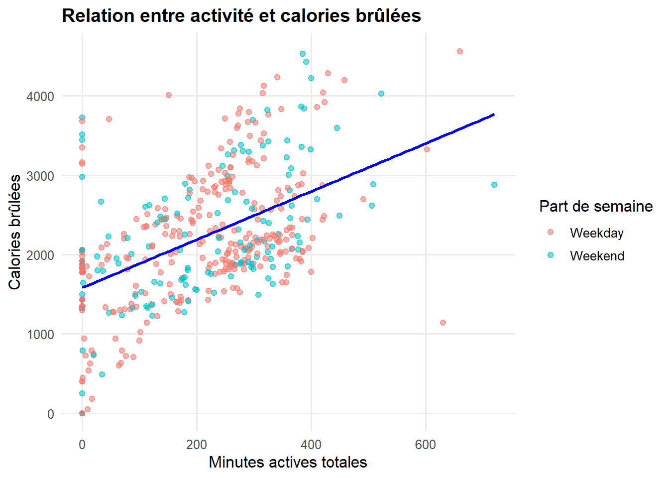 Le graphique montre une relation positive : plus les minutes actives augmentent, plus les calories brûlées sont élevées. Les catégories Weekday et Weekend suivent pratiquement la même dynamique. Les minutes actives sont le principal moteur de la dépense calorique, indépendamment du jour de la semaine.