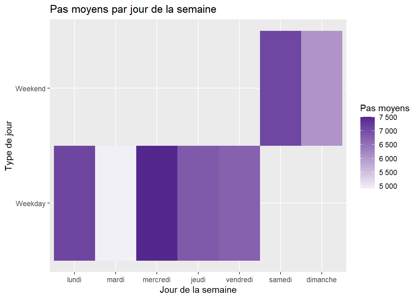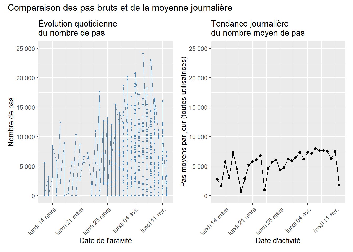 En agrégeant les données par date, une tendance claire émerge : le nombre moyen de pas augmente progressivement de début mars à début avril, passant d’environ 3 000–4 000 à 6 000–7 500 pas. Plusieurs chutes ponctuelles apparaissent (vers le 18 mars, le 31 mars et le 12 avril), liées soit à une baisse d’activité générale, soit à une diminution du nombre d’utilisatrices actives ces jours-là. L’ensemble traduit une dynamique collective de plus grande activité au fil du temps.