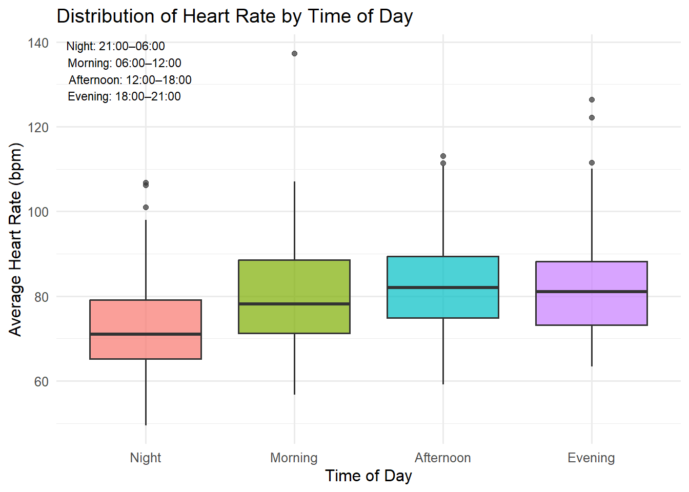 Heart rate is consistently higher during the day—especially in the afternoon and evening—and reaches its lowest levels at night.