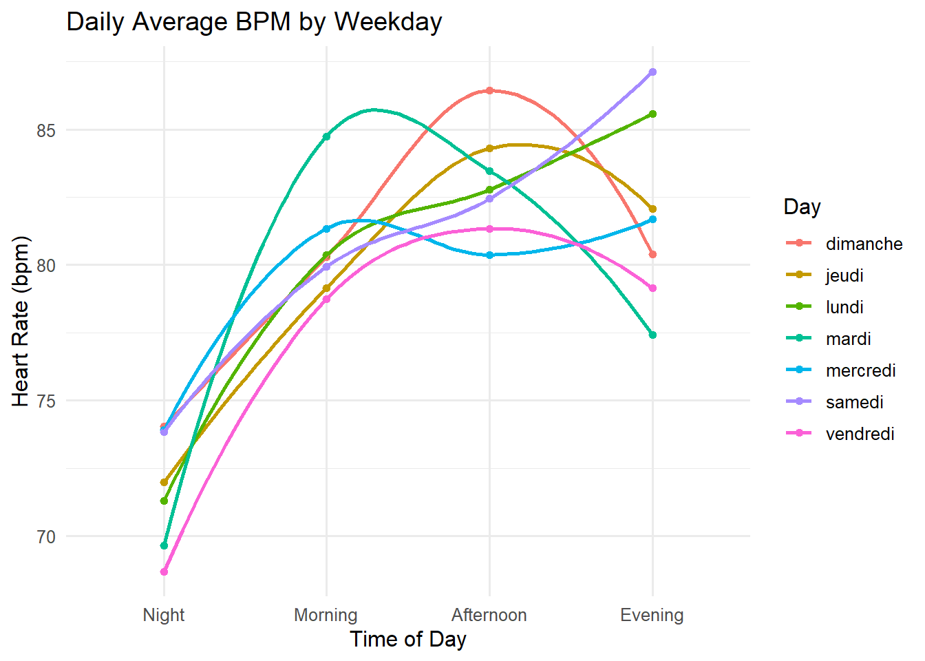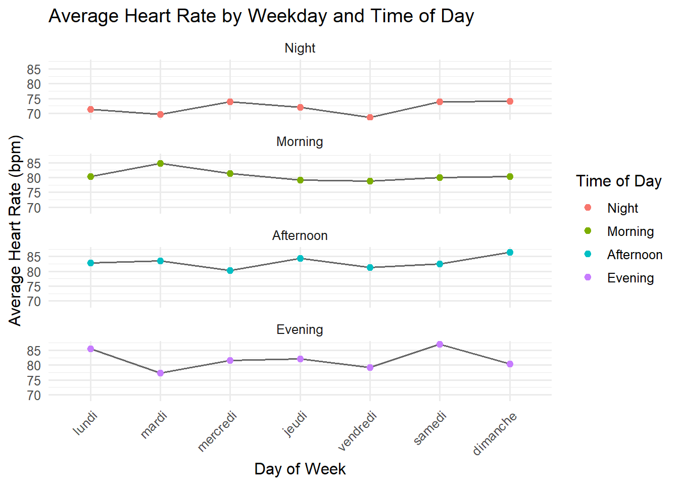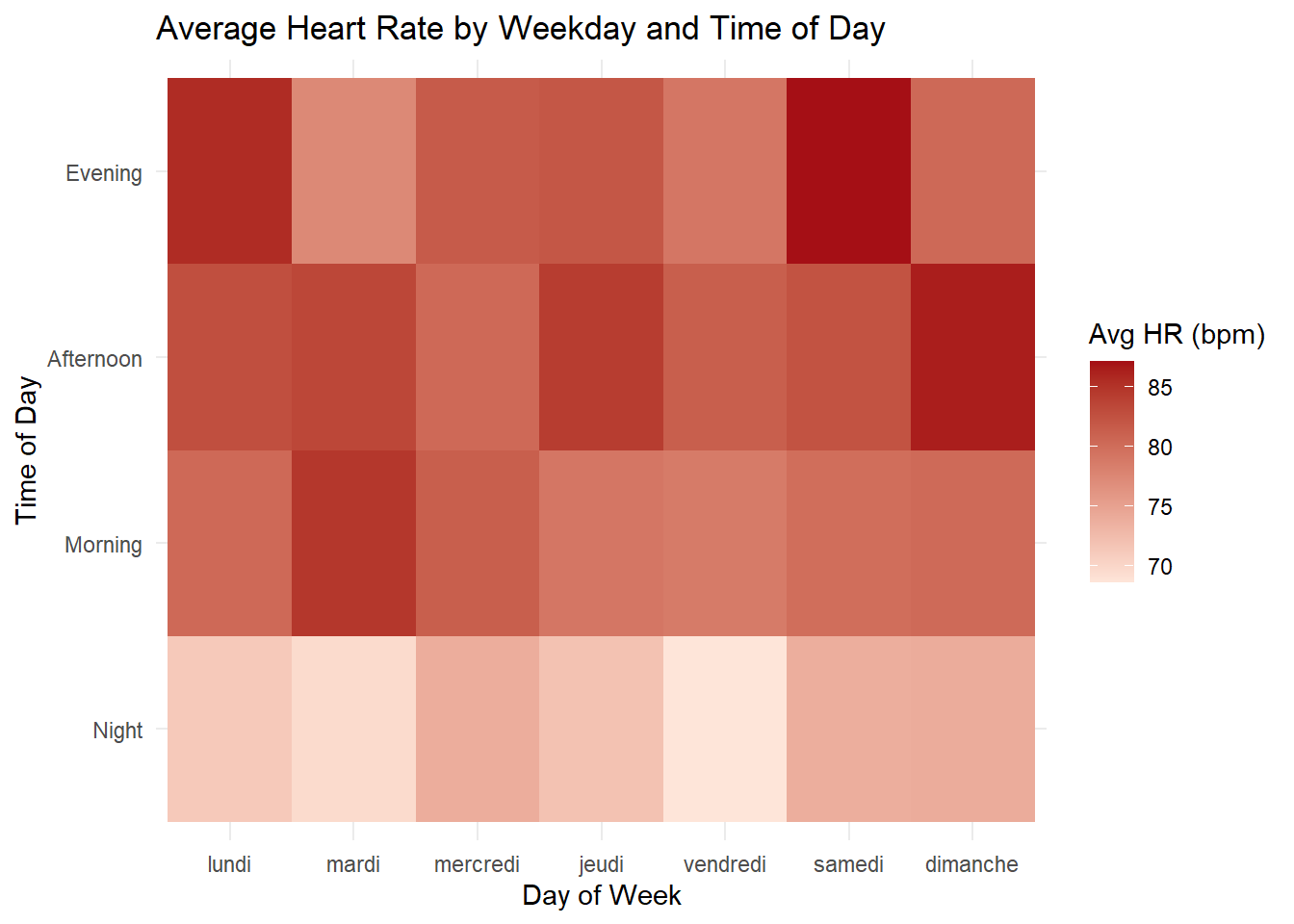 Heart rate follows a consistent circadian rhythm: lowest at night, rising in the morning, peaking in the afternoon, then decreasing in the evening. Differences between weekdays are modest compared to the strong variation between times of day. A slight weekend effect appears, particularly on Sunday morning and Saturday evening, which show slightly higher levels than other days.