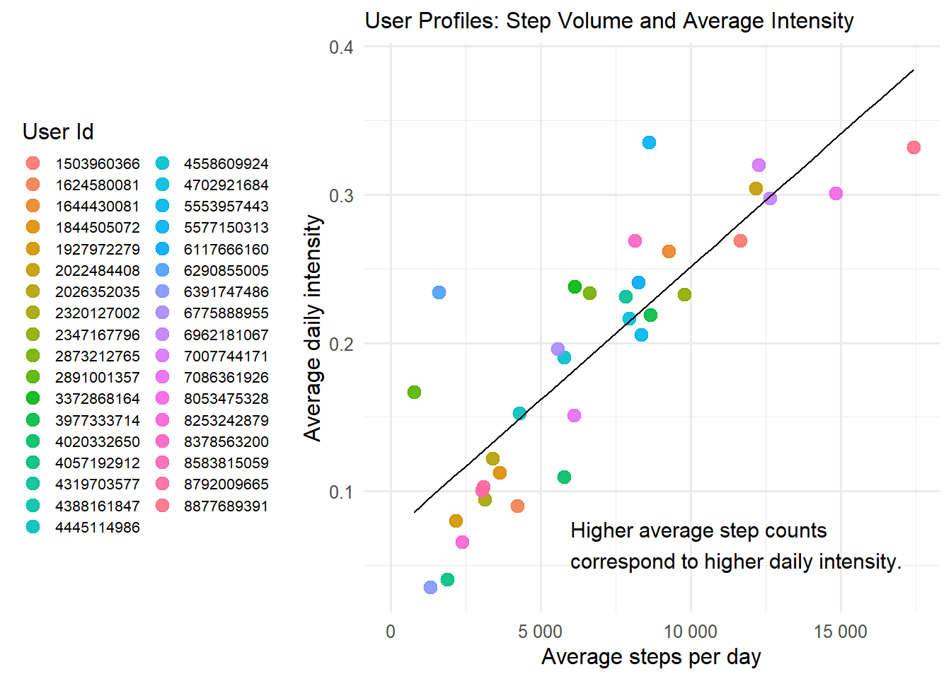 The chart reveals a direct relationship between step volume and average intensity: the more users walk, the higher their sustained effort. The correlation is linear: higher volume is accompanied by higher intensity, reflecting a combination of quantity and quality of effort.